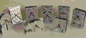 Der ausgewählte Entwurf wird als Rechteck (100x150 mm) mit der Papierschere ausgeschnitten und mit Klebstoff auf ein Aluminiumblech geklebt. Die Bohrungen zum verschrauben der beiden Blechplatten müssen in beiden Platten gemeinsam gebohrt werden, damit sie beim Verschrauben dann auch wirklich fluchten. Achtung: zum Bohren müssen die Bleche immer mit der Grippzange oder einer Kombizange mit Kartonbeilage gehalten werden. Bleche niemals nur mit der Hand halten, es besteht Verletzungsgefahr. Man kann dünne Bleche auch nicht in den Bohrschraubstock einspannen, weil sie sich dabei verbiegen würden und dann mit dem Bohrer mitdrehen könnten. Die Bohrmittelpunkte sollten vor dem Bohren angekörnt werden, damit die Spitze des Bohrers beim Ansetzen nicht verrutscht. Die große Bohrung ?10 mm zum Befestigen des Uhrwerks sollte mit dünneren Bohrern vorgebohrt werden. Nach dem Bohren sind die Bohrungen mit dem Handversenker zu entgraten. Anschließend werden die Schnittkanten gefeilt und mit dem Schmiergelleinen geschliffen. Mit dem Schleifschwamm kann man die Blechflächen am Ende noch ganz glatt schleifen. Die vier Distanzhülsen werden von einem Aluminiumrohr ?6x4 mit der Puck- oder Gehrungssäge auf 30 mm Länge abgesägt und dann entgratet. Zunächst wird dann das Uhrwerk auf dem Zifferblatt von hinten eingesetzt (Gummibeilagen und Kartonbeilagen nicht vergessen), die Messingmutter angesetzt und mit dem Uhrwerkschlüssel festgezogen. Dann wird die hintere Aluplatte mit den Zylinderkopfschrauben und den Hutmuttern befestigt. Die Zylinderkopfschrauben werden von hinten nach vorn eingeschoben und die Hutmuttern vorne angeschraubt . Die 3 Zeiger sind in der Reihenfolge Stunden-, Minuten- und Sekundenzeiger aufzustecken. Dann werden sie mit der Blechschere auf die richtige Länge gekürzt.